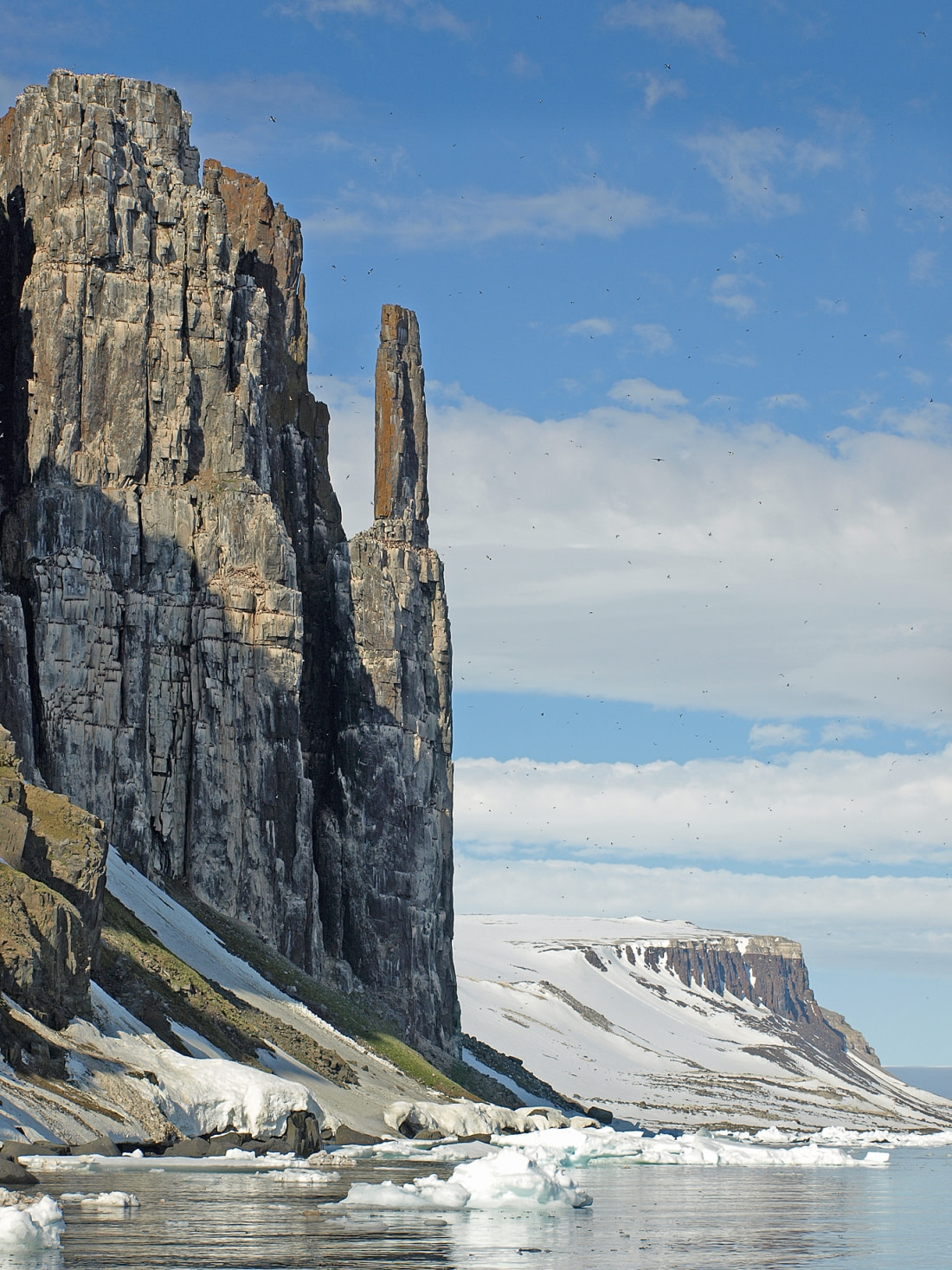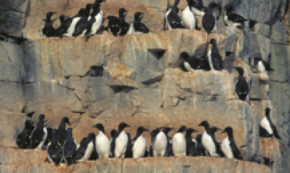 The huge bird cliffs along the Spitsbergen coasts are a major attraction. Spitsbergen is a breeding ground for large numbers of seabirds that feed in the food-rich Arctic waters. During the summer, the steep bird cliffs throng with thousands of seabirds.
