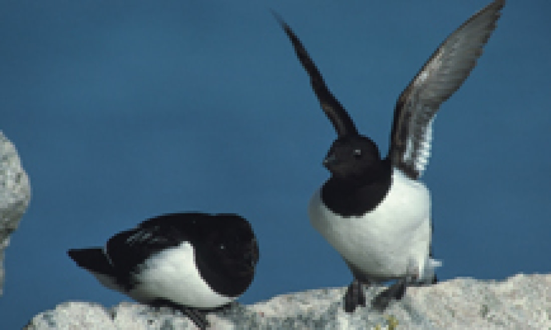 Brunnich’s guillemots, black guillemots, northern fulmars, kittiwakes, little auks, and many other birds prefer the steep ledges in order to stay out of reach of predators, such as the Arctic fox. Arctic terns, ringed plovers, purple sandpipers, and four species of skua stay down on the tundra, where they depend on their camouflage or aggressive behavior for protection.