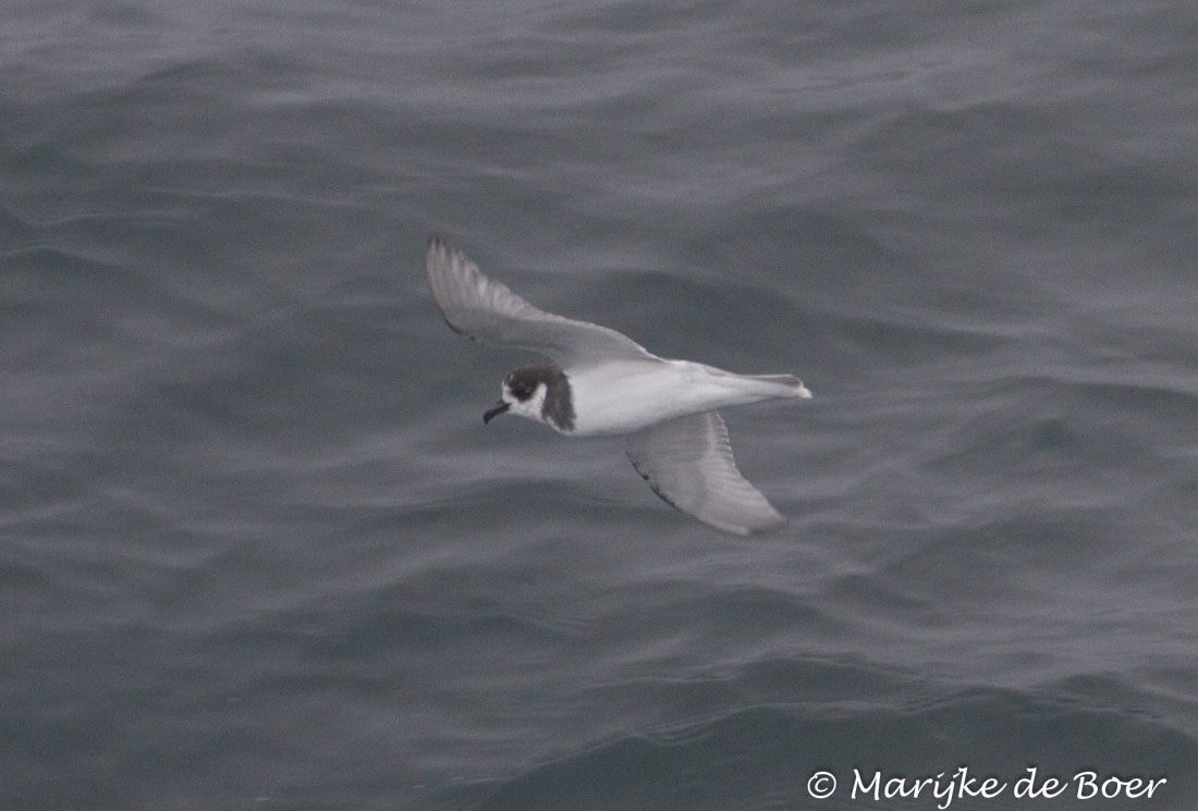 Appearance: White undersides and face, blue-grey topsides. Black mask around eyes. Black bill. White tip on tail. Darker M spreading across front of wings from wingtip to wingtip.