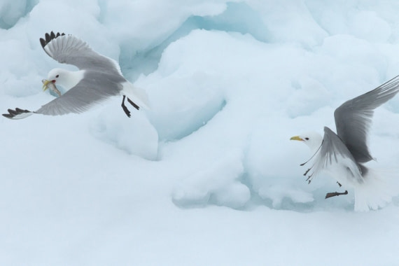 Kittiwakes hunt in flocks during the daytime, floating on the water and dipping their heads in to catch fish, or making the occasional shallow dive. Unlike other types of Gulls they do not tend to feed at garbage dumps, preferring to feed far out in the oceans. They will however follow ships in an attempt to scavenge from their refuse.