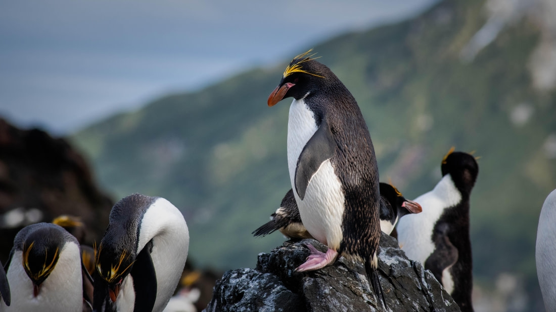Chicks and eggs are vulnerable to predatory sea birds like the skuas and petrels, while adult macaroni penguins on the sea are preyed upon by some seal species and orcas