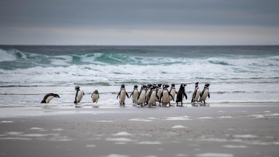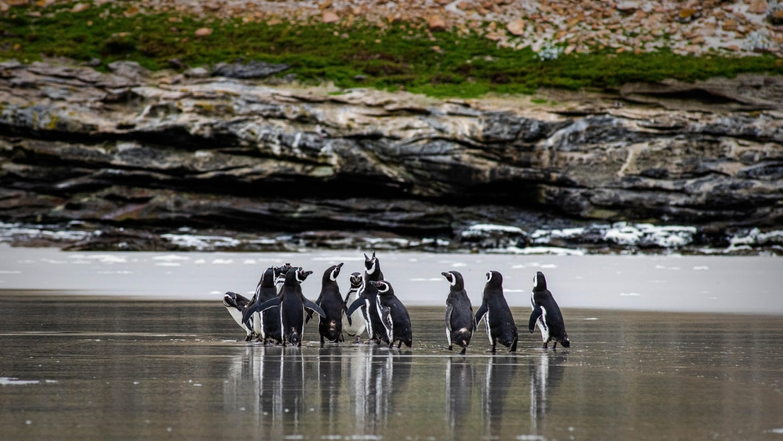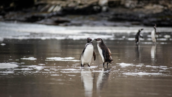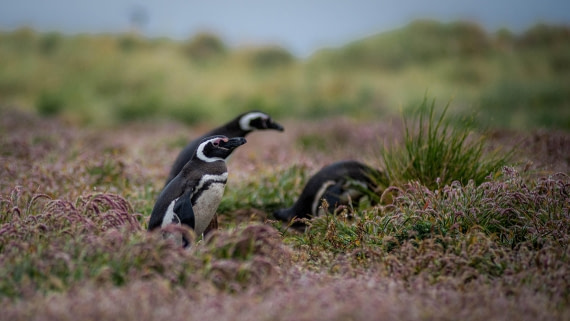 Magellanic Penguins stay together in flocks as they hunt for food. They join larger colonies on land when breeding season arrives.