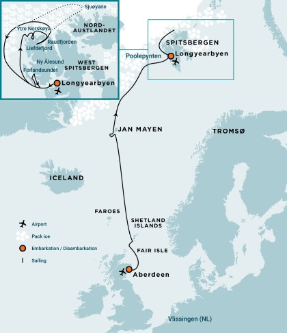 Sailing between the Scottish port of Aberdeen and our most cherished Arctic archipelago, Svalbard, this expedition adventure explores the islands of Fair Isle and Jan Mayen as well as the amazing Spitsbergen ice edge, giving you the chance to search for whales, and other animals of the land, sea, and air.