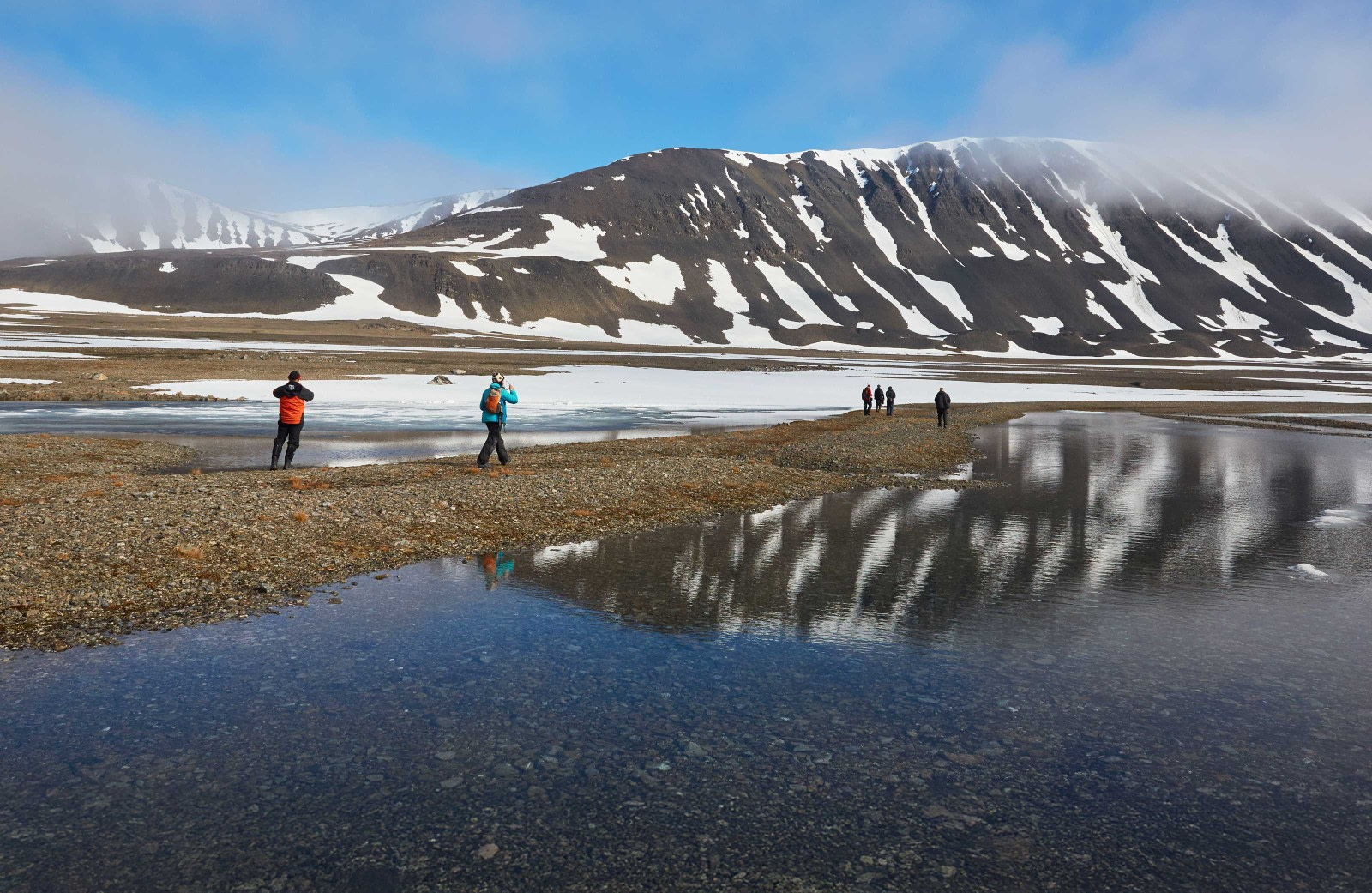 Walruses sometimes haul out in Forlandsundet, at Poolepynten. But if we cannot go there, we might sail to the mouth of Isfjorden, where we may see different species of rorqual whales. Our intended landing site is Alkhornet, where seabirds nest on the cliffs, Arctic foxes search below for fallen eggs and chicks, and reindeer graze the sparse vegetation. Another possibility is the glacier front in Ymerbukta, where you can see congregations of various eider duck species.