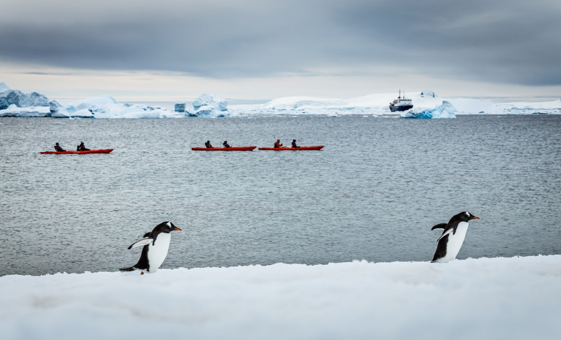 Kayaking is one of the best ways to immerse yourself in the beautiful blue-and-white world of the peaceful polar seas