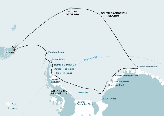 This adventurous expedition explores one of the least-visited areas on Earth, Antarctica’s amazing Weddell Sea. After visiting some of the same sites legendary explorer Ernest Shackleton’s charted in South Georgia, we’ll enjoy the Weddell’s exotic wildlife and colossal tabular icebergs.