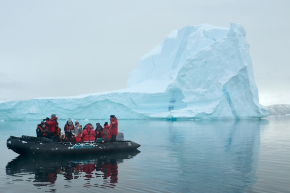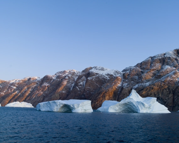 The goal is a Zodiac cruise near Sorte Ø, surrounded by icebergs. Their austere blue-white contrasts sharply with the sediment slopes nearby. The afternoon plan is to sail through the northern parts of Røde Fjord and into Harefjord, with the chance to see musk oxen and warm autumnal foliage.