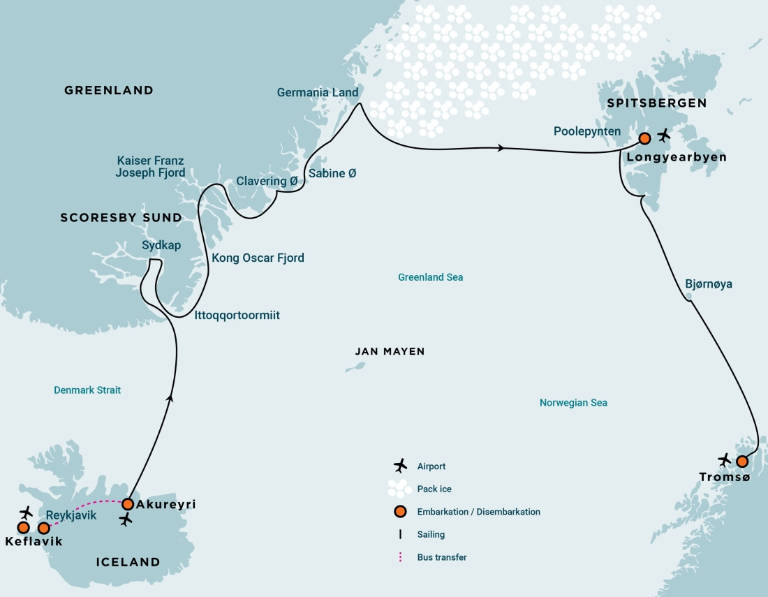 Chart an epic course from Iceland into the mazy fjords of Greenland and the beautiful world of the pack ice as you head north. Crossing the Greenland Sea, this combination cruise then takes you through the Svalbard Archipelago, exploring glaciers, mountains, and tundra, before crossing the Norwegian Sea and stopping at Bear Island en route.