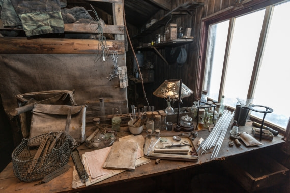 The inside interior of the hut shows furniture such as tables, chairs and beds. Canned food and seal meat is still present. The hut of Scott was used during the winter of 1911. From here, Scott and his team made his fatal journey to the South.