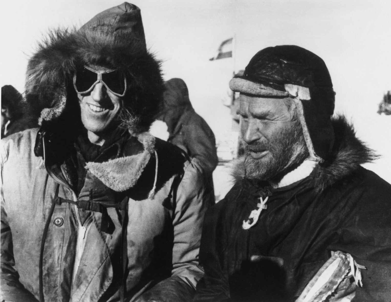 Explorer Sir Edmund Hillary (left) just after meeting English explorer Vivian Fuchs (right) at the South Pole, 20th January 1958.
