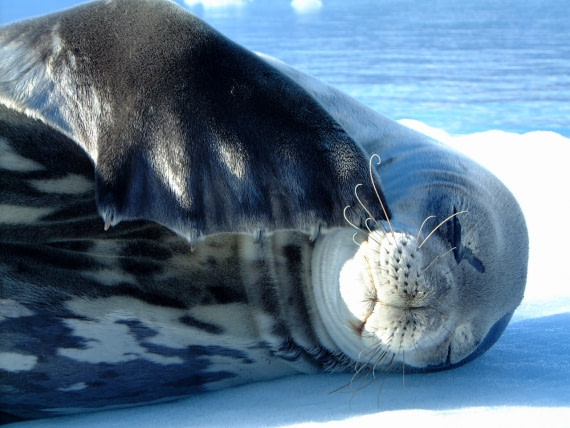 Weddell Seals tend to congregate together around breathing holes made in the ice. They’ll stay together in the water during the Antarctic winters with just their noses poking out in order to avoid the harsh winter winds.