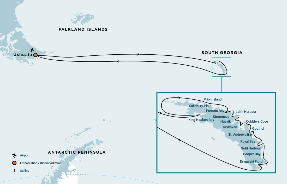 A group of adventurers aboard this voyage will travel part of Shackleton's historic route through South Georgia. They will begin their adventure in King Haakon Bay and be picked up a few days later in Stromness Bay.