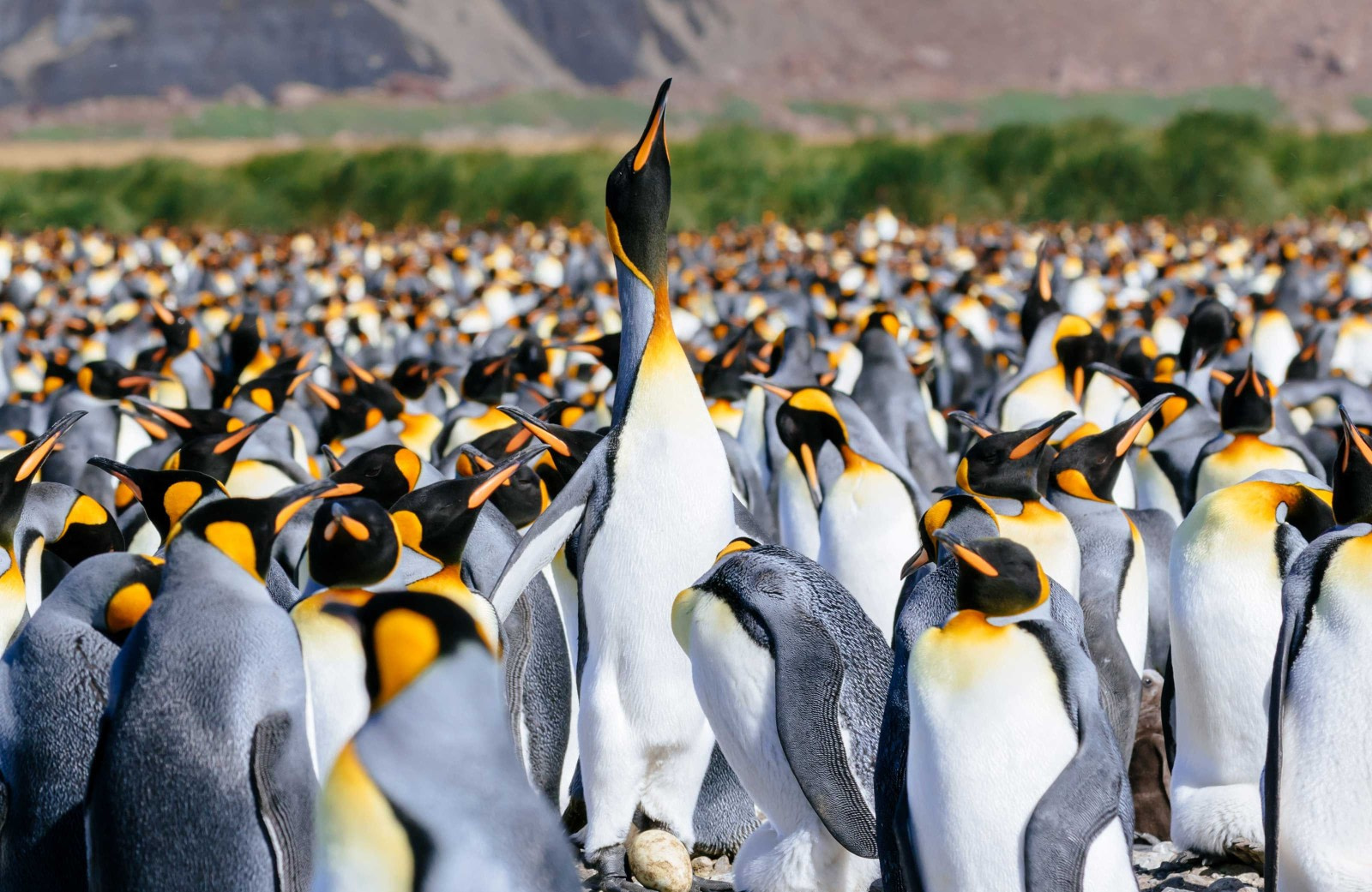 Thousands of king penguins, hundreds of gentoos, and loads of elephant seals share this awesomely scenic South Georgia bay